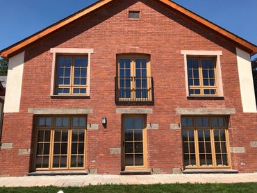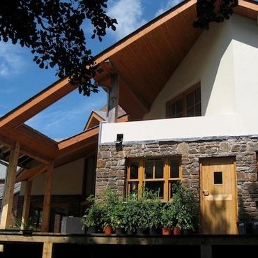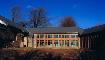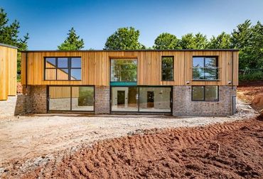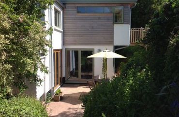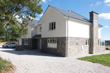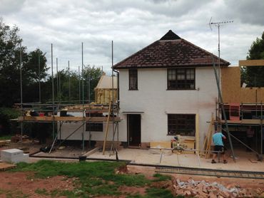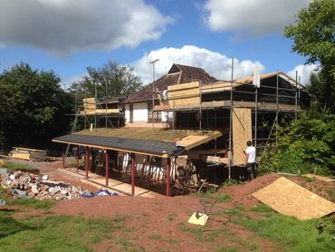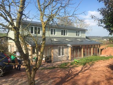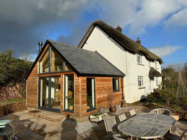 All that remained of the existing cottage here was the walls of the middle third. The right-hand third is new timber frame on two floors and the left-hand third was a single-storey extension that we changed into two stories and put a new roof over the whole house. The front single-storey sun room is an open plan, south facing, kitchen/dining area and entrance hall.